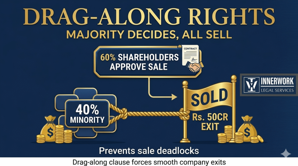 Imagine 60% of your shareholders find a Rs. 50 crore buyer ready to acquire the entire company. Everyone’s thrilled – except the 40% minority shareholder who suddenly decides he wants to keep working there forever. The deal collapses because buyers want 100% ownership, not a fractured company. This is where drag-along rights become your savior.