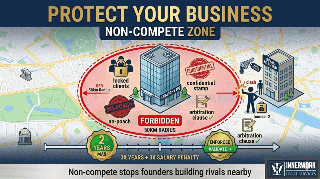 The non-compete clause blocks this completely. For two years after exit, they cannot start a competing business within 50km of your operations. No soliciting employees or customers, no using confidential information. Penalty equals three times their annual salary. Bombay High Court upheld exactly this in a 2024 tech case – it’s fully enforceable when properly drafted.