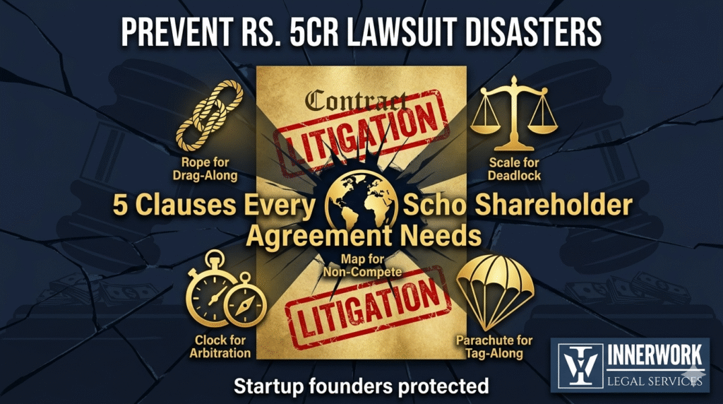 Founders shake hands saying “We’ll split everything 50-50!” Then money rolls in and suddenly it’s “I own 51%, my rules.” Indian courts see partnership disputes daily – deadlocks, director fights, secret side deals. Without clear clauses, you’re gambling your business on judge’s mood. Small businesses lose Rs. 2-5 crores yearly in preventable litigation.5 Clauses That Stop Fights Before They StartThese aren’t lawyer fancy words. These are battle-tested clauses from agreements that actually prevented court cases.