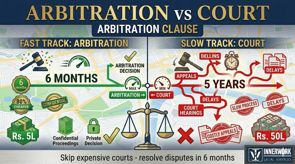 The arbitration clause sends ALL disputes to a pre-agreed arbitration center like Delhi or Mumbai. Three arbitrators make a final decision with no appeals. Loser pays all costs. Result? 6 months resolution vs 5 years, confidential proceedings protect reputation, and 80% cheaper than court. Bangalore SaaS founders resolved their dispute in 4 months this way instead of facing a 3-year court battle.