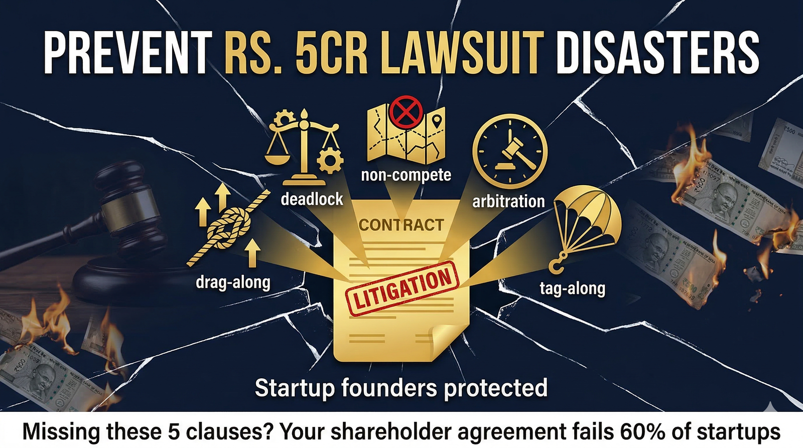 “5 must-have clauses for partnership & shareholder agreements: Drag-along rights, deadlock resolution, arbitration. Prevent costly litigation. Indian startups 2026 guide.”