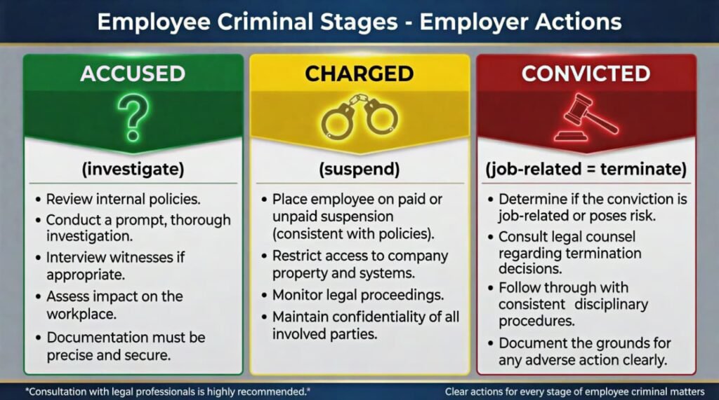 Example: Employee arrested for drug possession. If job involves driving company vehicles → suspend license immediately.