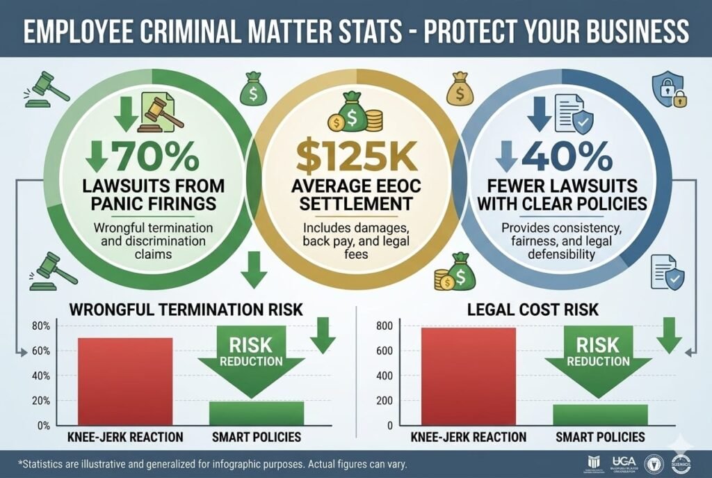 - 70% of wrongful termination lawsuits from knee-jerk firings after arrests