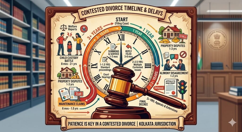 A contested divorce in Kolkata could take anywhere from 12 months to 3 years or more, depending on: